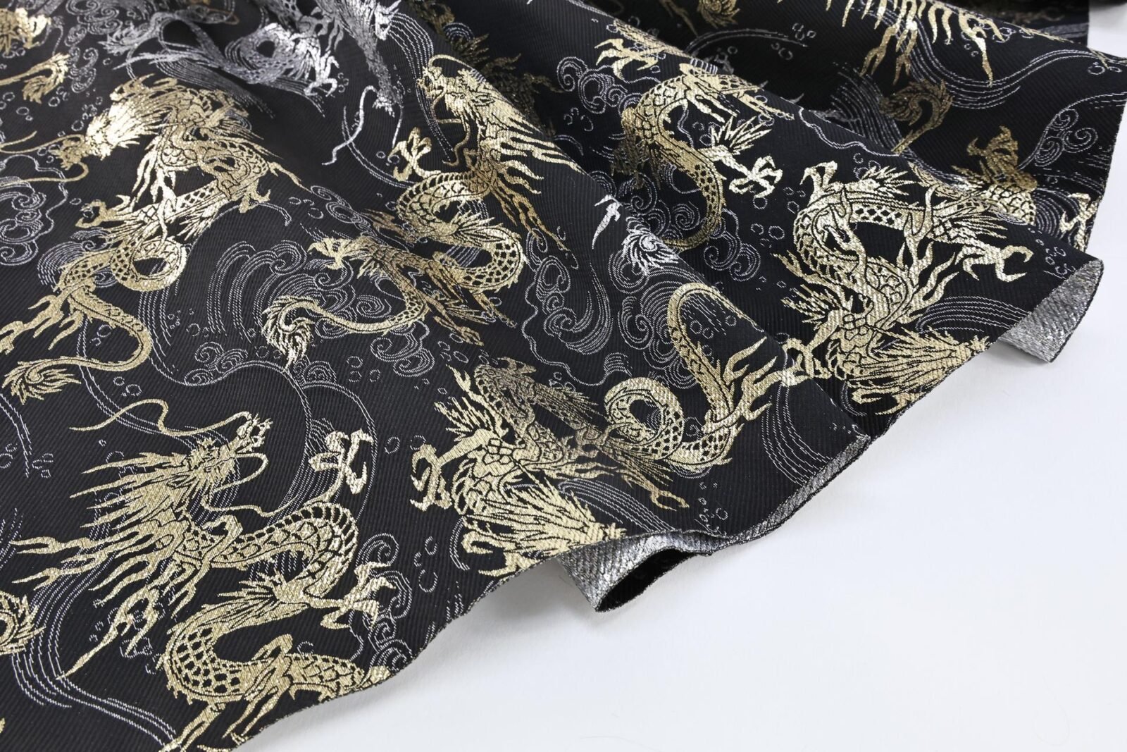Tissu brocart jacquard Japonais tissé les dragons dorés et argentés