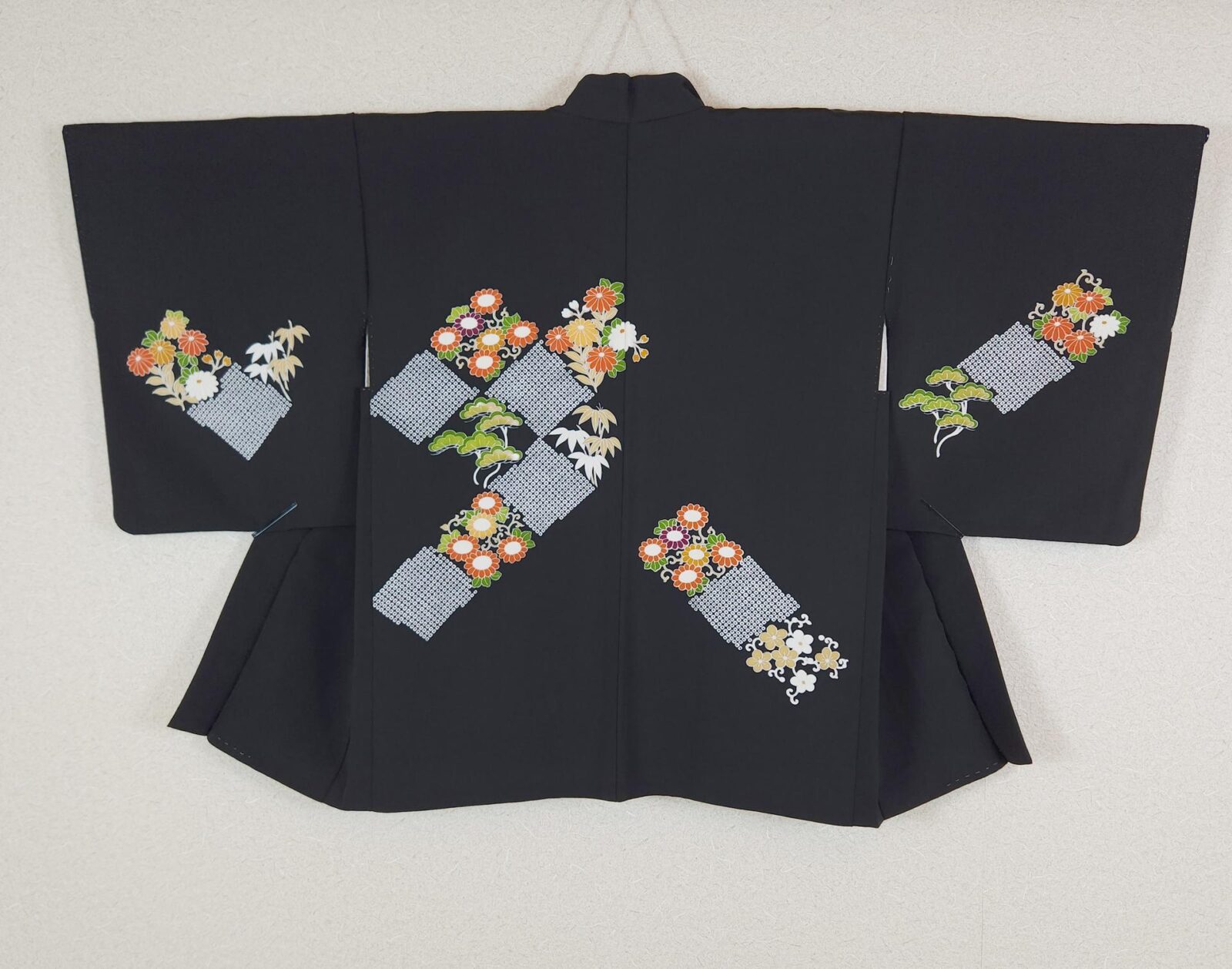 Black Yuzen Haori with flowers and Kanoko. Beautiful Japanese black Haori decorated using the traditional Yuzen technique, featuring delicately hand-painted colorful flowers. The design combines floral motifs in shades of orange, yellow, green, and white, accented with finely detailed white Kanoko areas that bring rhythm and elegance to the overall composition. The contrast between the deep black background and the bright motifs highlights the craftsmanship. The interior is lined with a simple light-colored fabric. This Haori is in good condition. Being a vintage/used piece, it may show some stains or defects.
