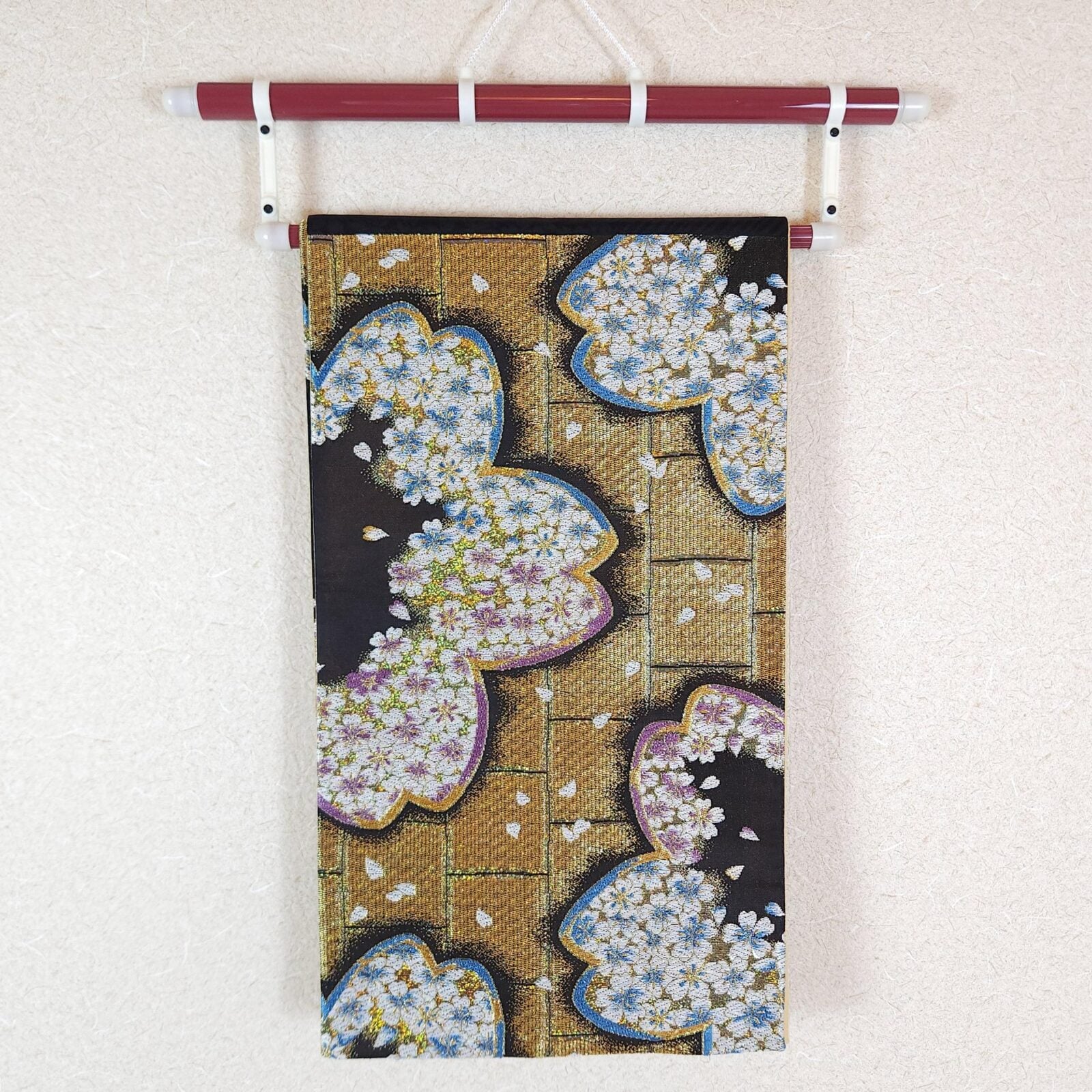 Golden Sakura Fukuro Obi. Rare and magnificent Fukuro obi woven in golden jacquard, decorated with large Sakura motifs filled with small pink, blue, white, and lilac flowers on an elegant square-patterned background. The contrast between the luminous gold, deep black, and colorful outlines gives this obi belt a very refined and original style. The scattered petals and sparkling details bring movement and a rich visual presence to the whole design. The other side is also woven in black brocade with Sakura motifs, allowing this obi to be used on both sides depending on the style you want. This beautiful Japanese textile is ideal to pair with a formal Kimono, for collection, or for decoration. Obi in good overall condition. Being a vintage/ used piece, it may have some stains or defects.