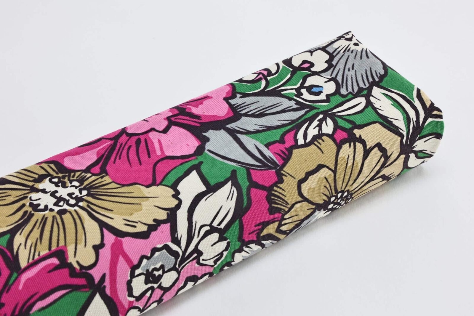 Japanese Oxford fabric colorful retro flowers green background. Beautiful Japanese Oxford cotton fabric printed with large floral motifs in bright colors, in a vintage and retro style. It features lovely flowers in pink, grey, beige, highlighted with black outlines that give the design plenty of character. The fabric is slightly thick, with a comfortable texture and good body. It remains pleasant to work with for creative sewing and everyday projects. Ideal for making accessories, clothing, patchwork, pouches, bags, or textile décor.
