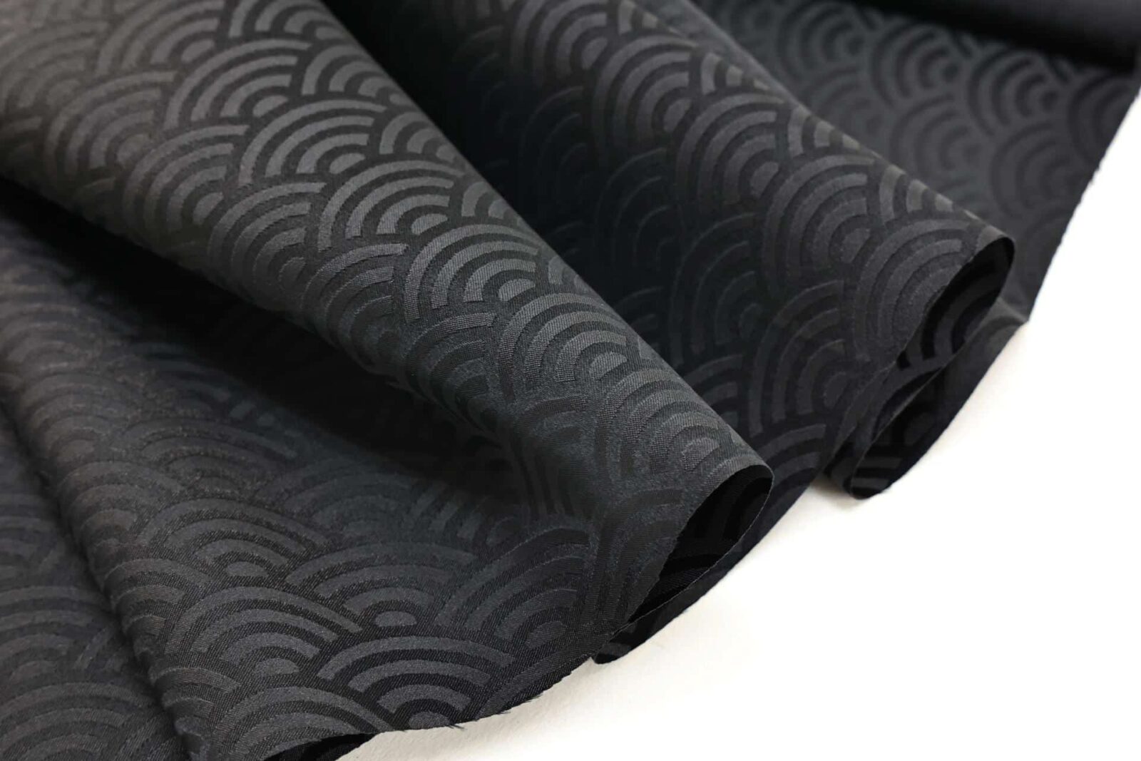 Japanese Seigaiha jacquard fabric black. Beautiful Japanese jacquard fabric woven with an Seigaiha geometric motif, inspired by the ocean wave, in an elegant solid black shade. The tone-on-tone design reveals delicate and refined highlights depending on the light, giving the fabric a clean and very chic look. Light, fluid, and pleasant to the touch, it has a beautiful drape. Its delicate weaving adds texture without making the fabric heavy. It is perfect for sewing clothing, linings, accessories, textile decoration, or elegant creations inspired by Japanese style.