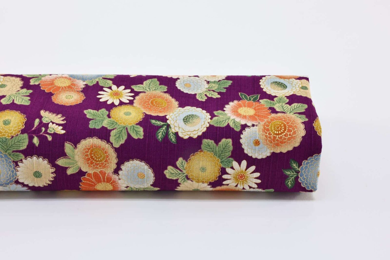 Japanese shantung fabric chrysanthemums purple background. Beautiful Japanese cotton shantung fabric printed with colorful chrysanthemums with delicate golden outlines on an elegant purple background. The orange, yellow, light blue, and cream flowers create a refined and luminous pattern, while the slightly irregular shantung weave adds a lot of charm to the fabric. Comfortable and of beautiful quality, it is ideal for making clothing, accessories, patchwork, and other Japanese-inspired sewing projects.