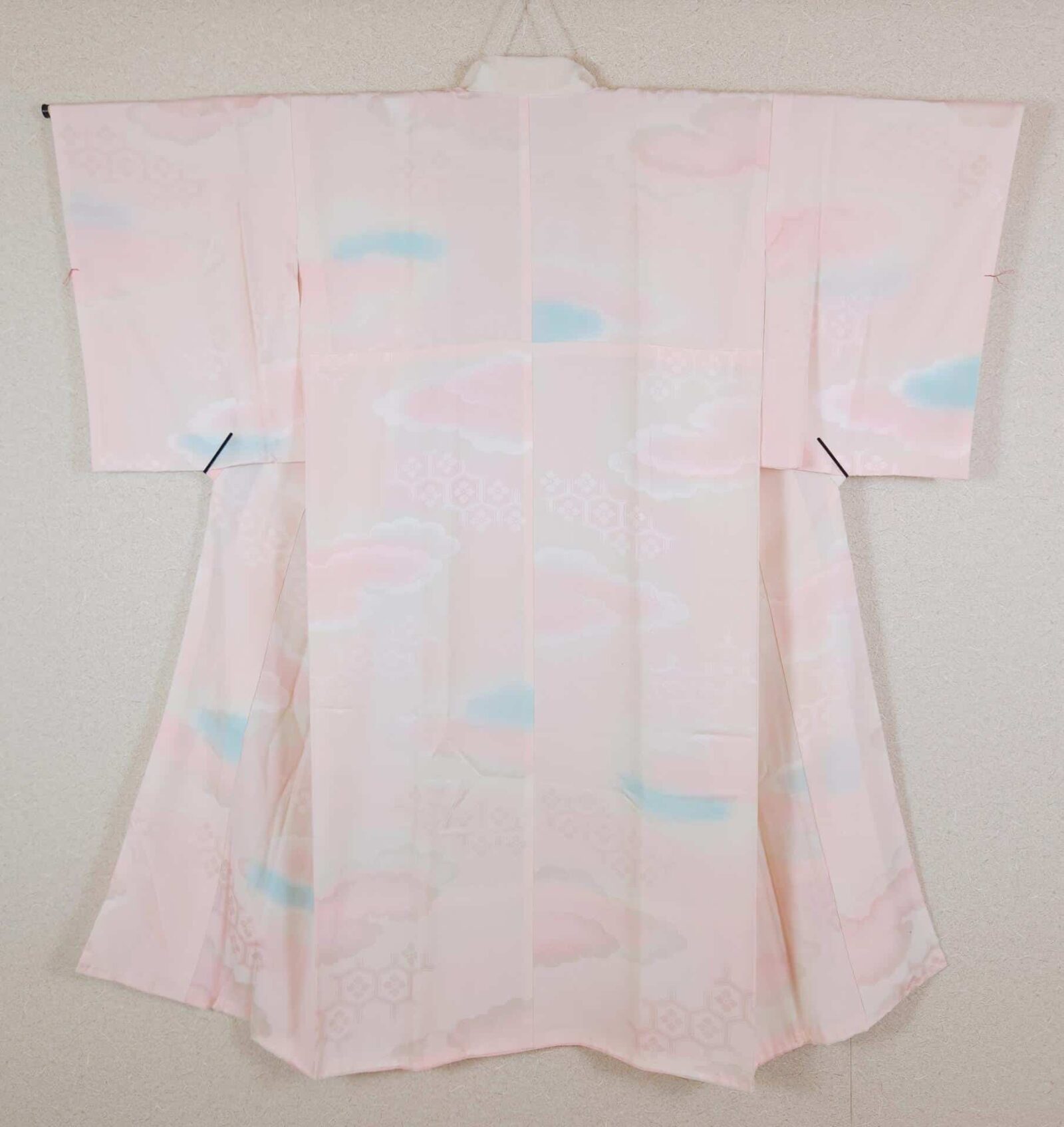 Pink and blue brocade Nagajuban with woven clouds. Beautiful Japanese Nagajuban made of finely woven brocade featuring cloud and Kikkō patterns, in a delicate pink tone enhanced with very soft blue accents. The ecru jacquard collar has a refined texture with an elegant wave-like relief, creating a subtle and harmonious contrast. Light traces are visible on the collar and on the Nagajuban, but they remain invisible once worn under a kimono. This Nagajuban is in good overall condition. Being a vintage/used piece, it may show some stains or defects.