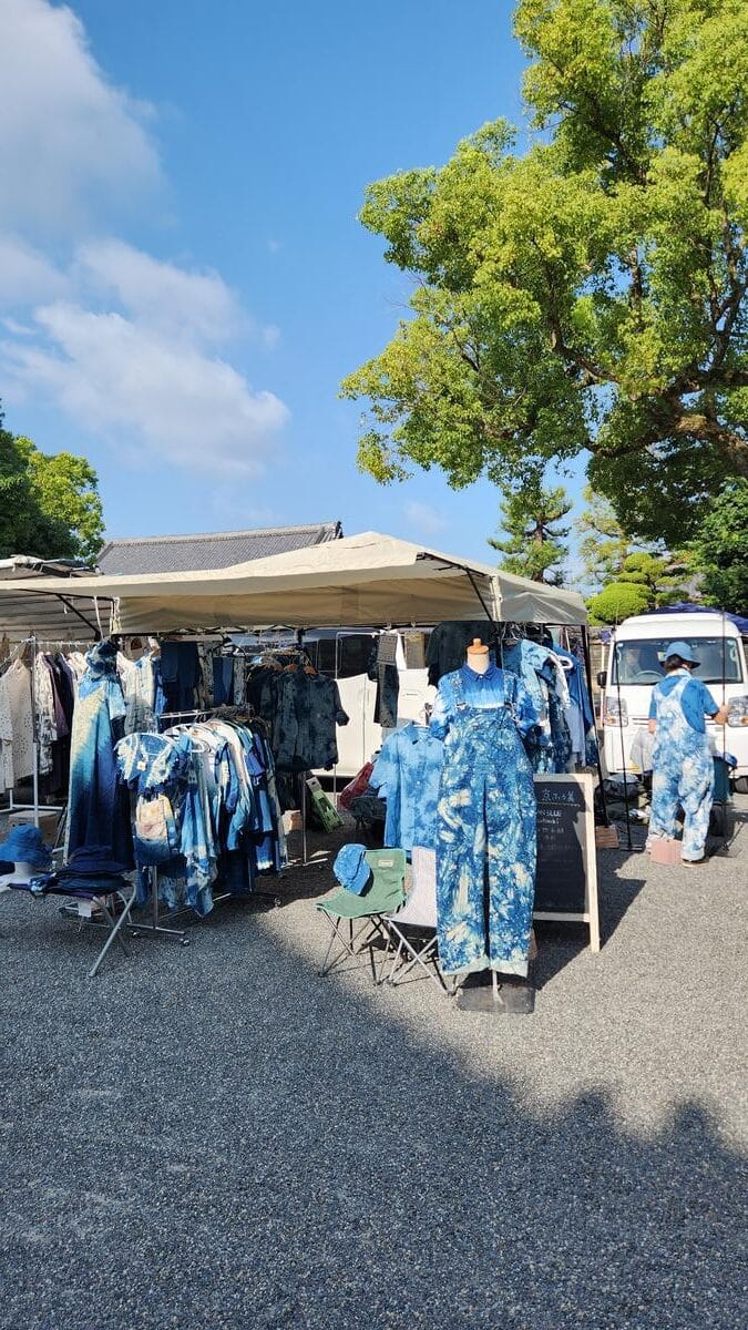 Not everything at Tōji is vintage, though. On one visit, we stumbled on a stall where every single piece of clothing was dyed in indigo shibori: jumpsuits, jackets, hats, even the vendor’s own outfit. It was a good reminder that shibori in Kyoto isn’t just a museum tradition. It’s a living craft, and it shows up in places you don’t expect.